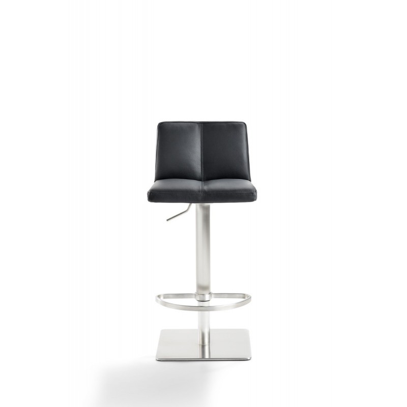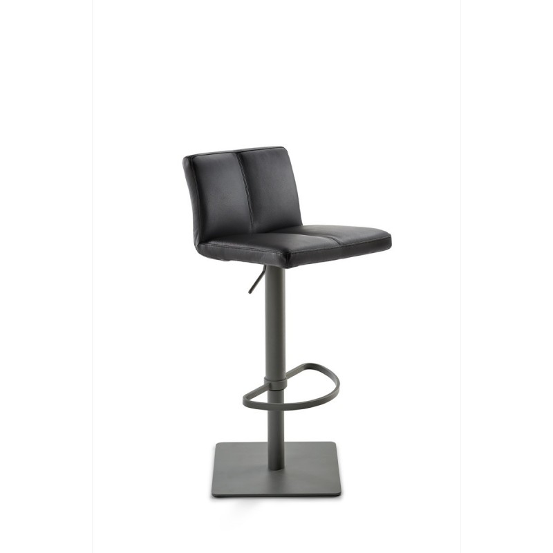 gepolsterte Sitzschale mit dekorativer Steppnaht, stufenlose Höhenverstellung durch Gasfeder, 360° Drehmöglichkeit, quadratischer Bodenteller, Design-Fußstütze, Sitzhöhe 53 -78 cm.