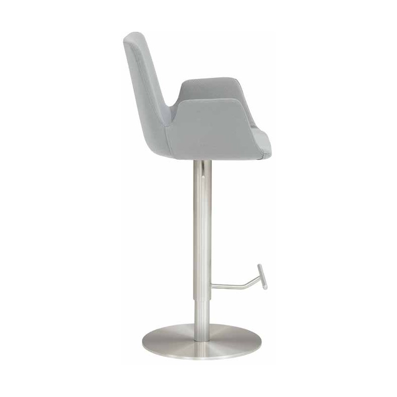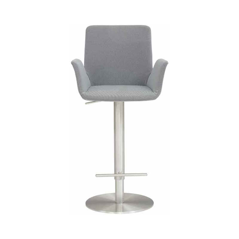 Sitz und Rücken bequem rundum gepolstert, mit integrierten Armlehnen, 360° Drehmöglichkeit, stufenlose Höhenverstellung durch Gasfeder, Design-Fußstütze, Sitzhöhe 55 - 82 cm.